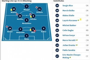 巴黎首发:1-纳瓦斯、4-科雷尔、2-蒂亚戈-席尔瓦、3-金彭贝、14-贝尔纳特、21-埃雷拉、5-马尔基尼奥斯、8-帕雷德斯、11-迪玛利亚、7-姆巴佩、10-内马尔